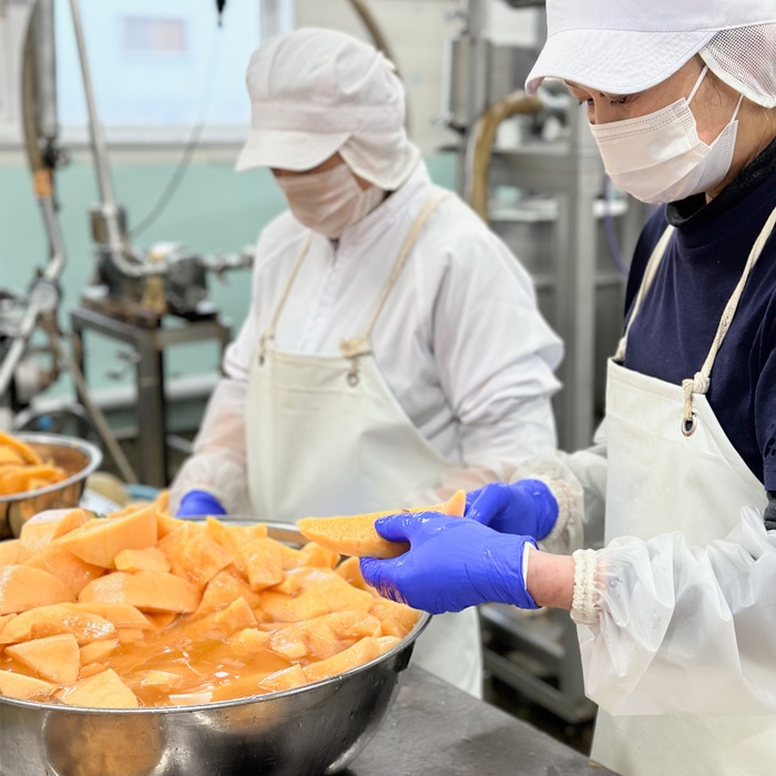手作業で一玉ずつカット・皮むき、そして粉砕・加熱・ろ過する繊細な加工により、風味豊かなメロンの味と滑らかな甘みを実現しています。